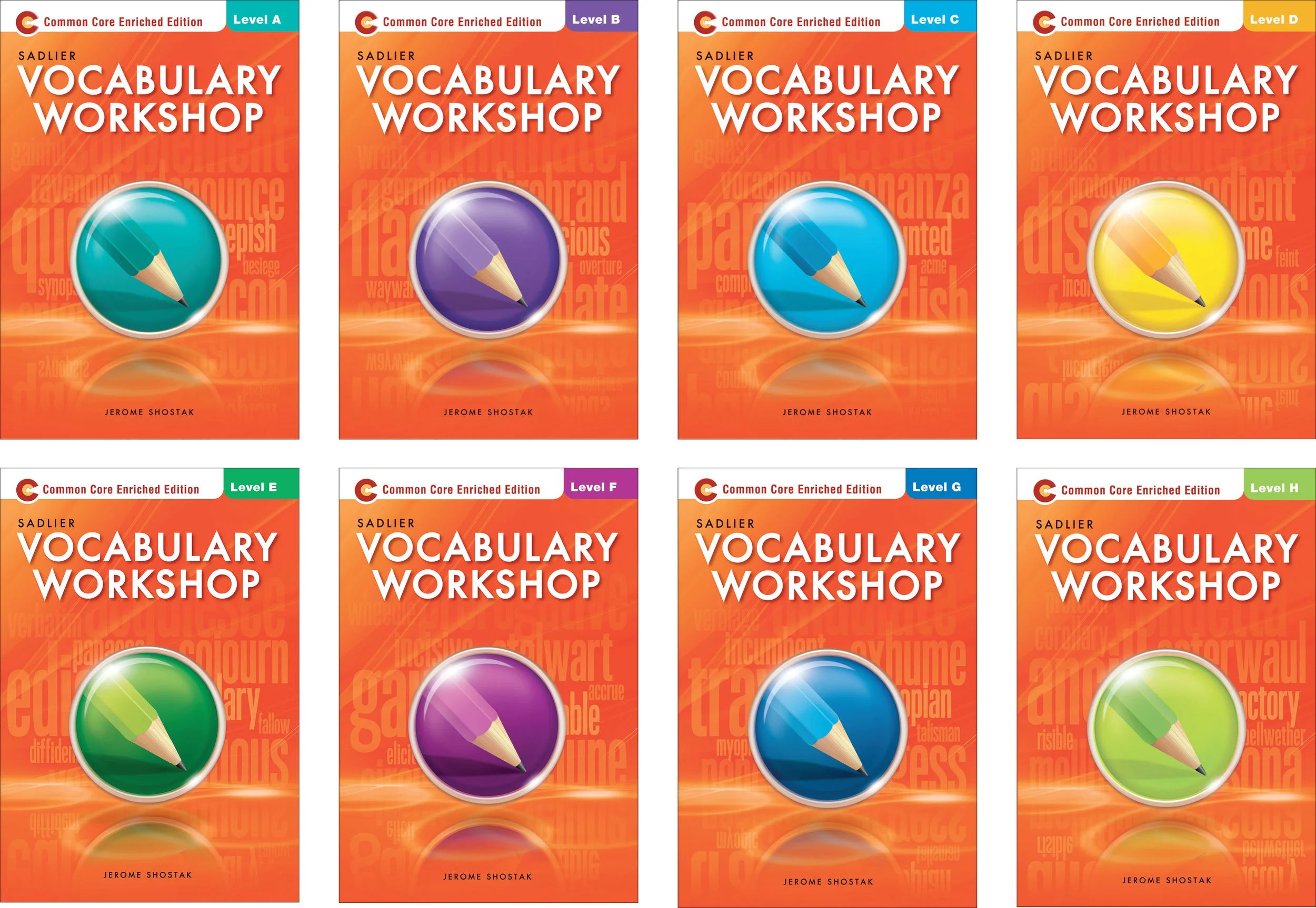 Vocabulary Workshop was everyone's darling in need of a facelift . . . in eight color schemes. The covers got the shiny, word-spangled treatment they deserved.